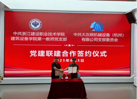 活动伊始,大灰熊机械设备(杭州)有限公司总经理裴善学、党支部书记徐关根、常务副总柳承杰等企业领导介绍了公司党建情况、企业概况及在技术创新、产品研发等方面取得的成果,建筑设备学院党总支书记杨文领介绍学院人才培养、校企合作、产教融合及新开设的智能工程机械专业建设等情况。会上,潘春鹏代表建筑设备学院第一教师党支部与柳承杰正式签订党建共建协议,共同希望通过校企资源的有效整合,切实把党建优势转化为发展优势,构建校企协同发展的良好局面,正式开启党建共建新篇章。